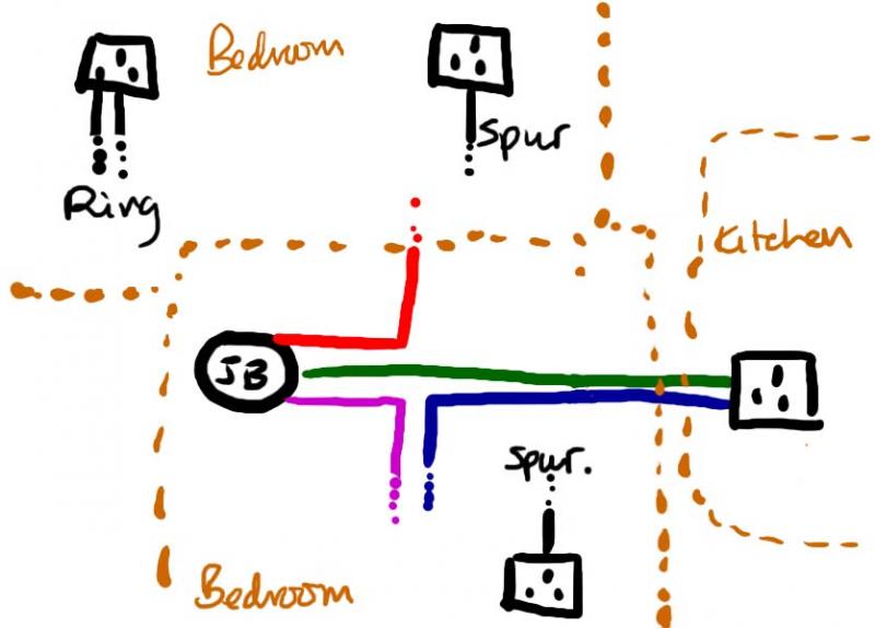 Mar 10, 2016. #6. stratplus said: I am a trainee yes Andy. Been trying to get my head round rings/Spurs and radials/Spurs. I can understand if you spur off a ring that piece of cable can take potentially 26amps (two 13amp fuses). Now if you spur off that spur your current could be 52amps so overloading the cable.