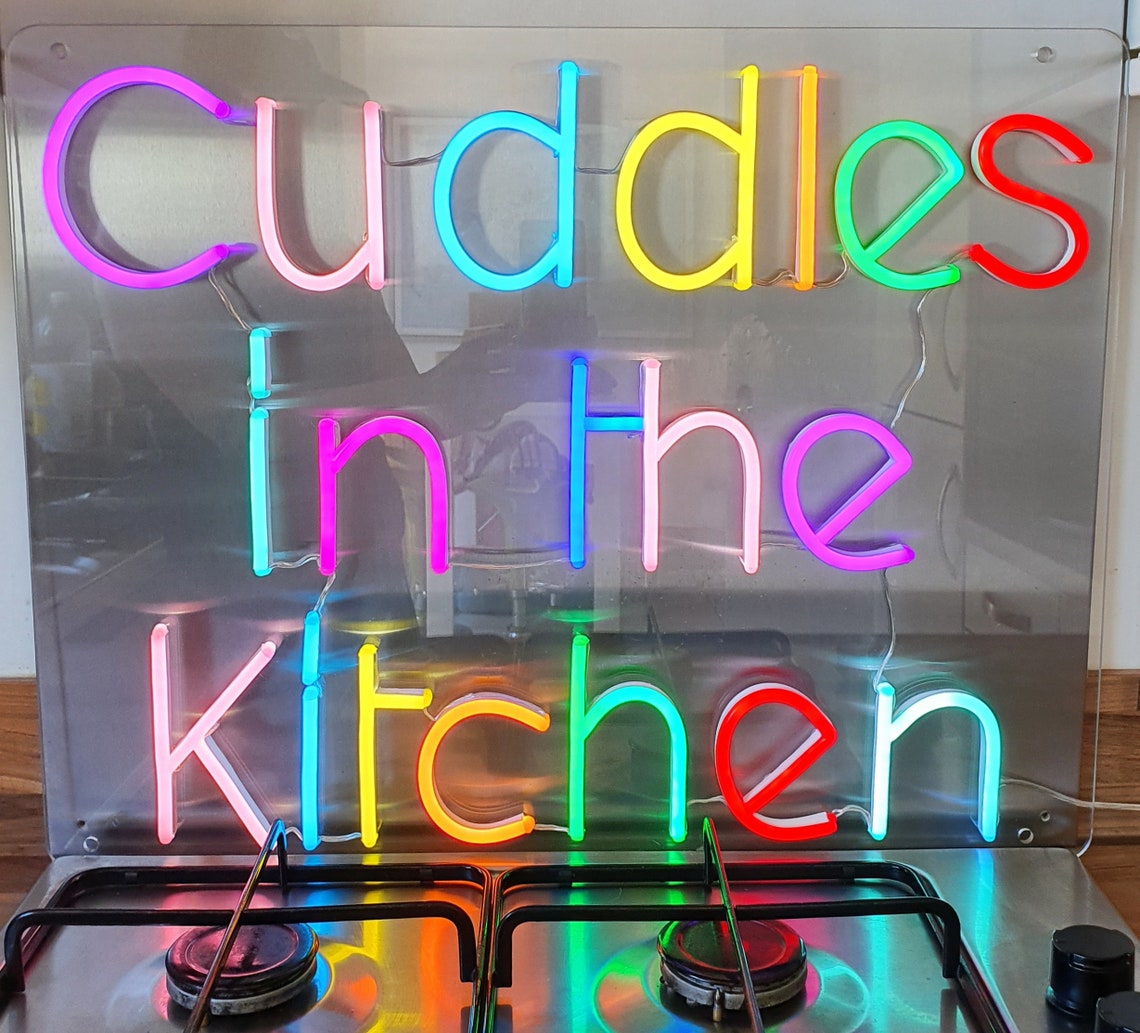 Cuddles in the Kitchen LED Neon Sign Multicolour LED Neon Sign - choice of size Other colours available on request Neon in Photo is 100cm Premium Quality - see Neon Info Page for more Shipping rates calculated at checkout Absolutely no hidden costs or surprise fees