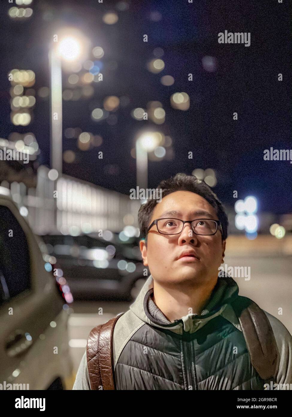 Portrait Of Young Man In Illuminated Roof Top Car Park At Night Against Building Lights Stock