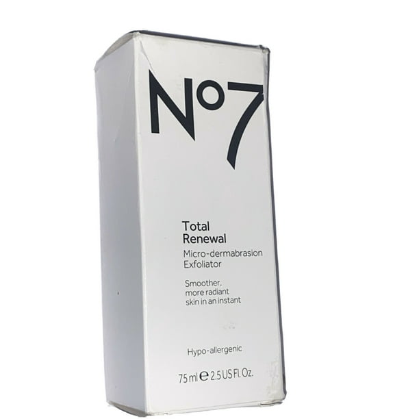 No7 Total Renewal Micro-dermabrasion Face Exfoliator 75ml; offer. No7 Total Renewal Micro-dermabrasion Face Exfoliator 75ml. €12.99. 4096266. 75 ML | €173.20 per 1L. 3 for 2 on selected No7 - cheapest free Save 10 percent when you spend €40 on selected No7 - online only.
